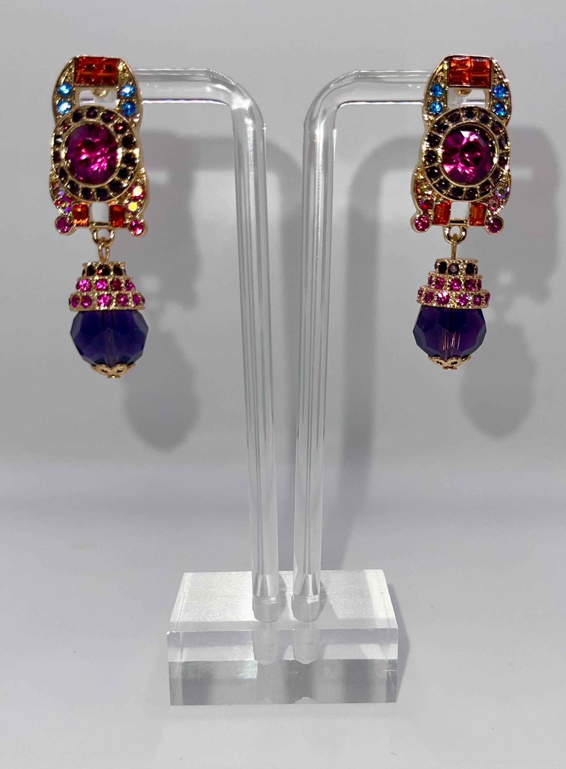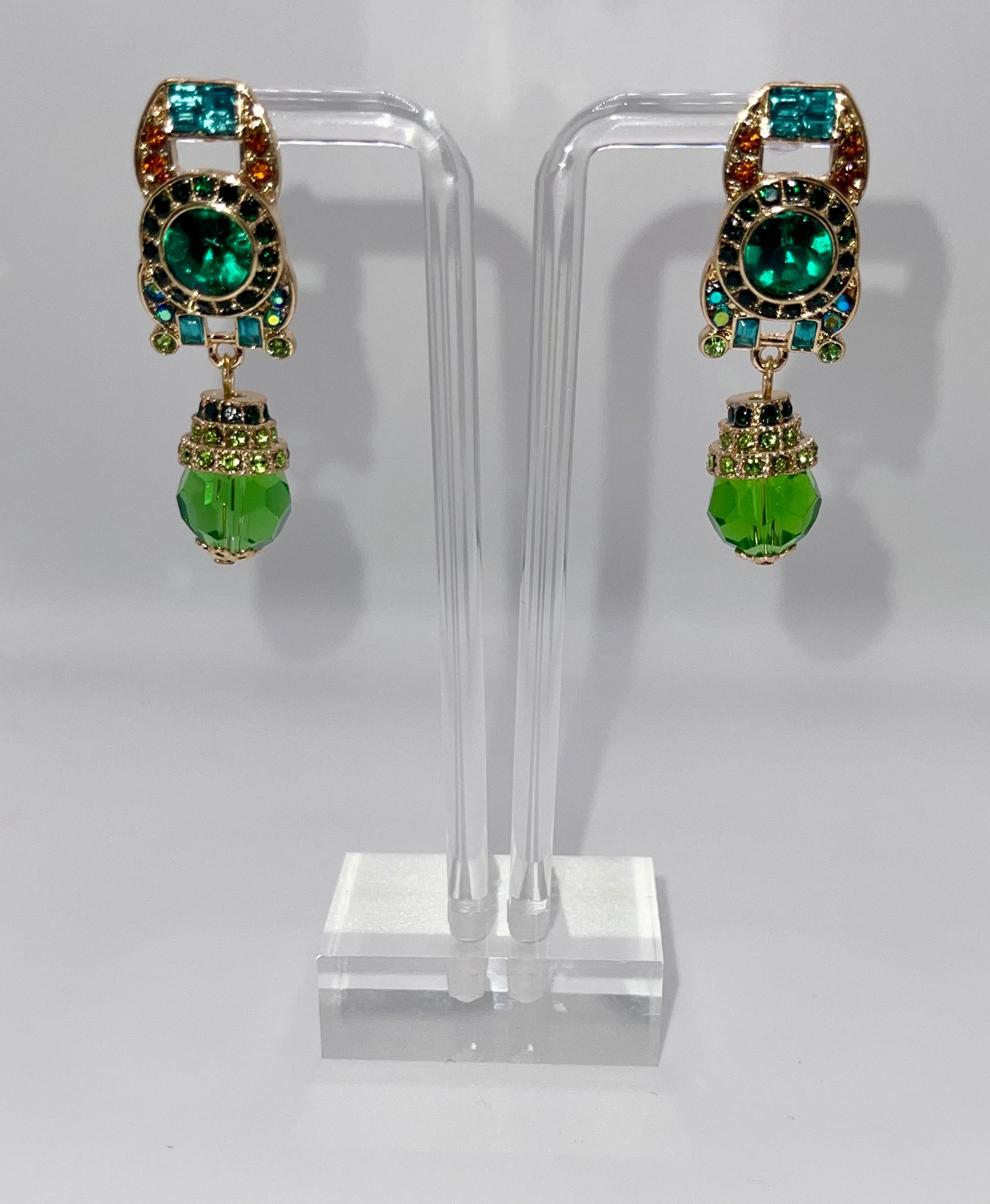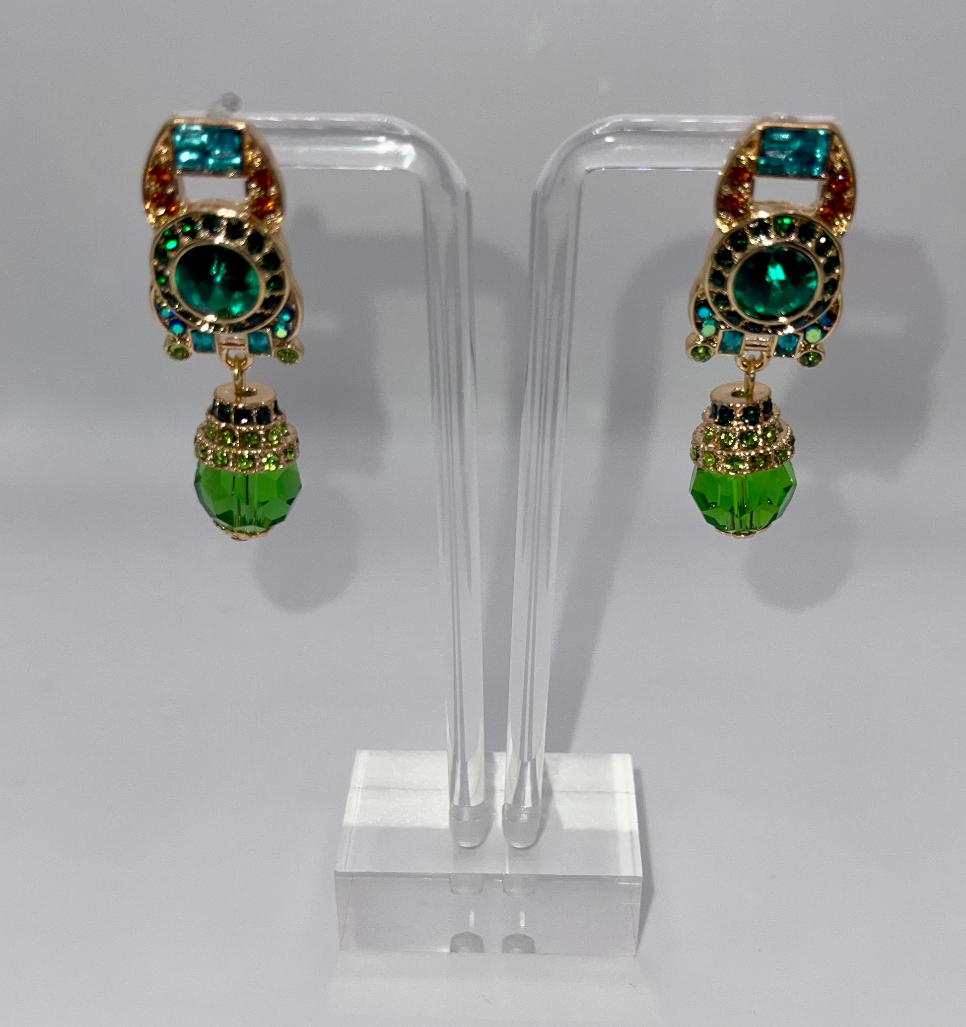 Earrings fit for a Queen! These dainty and romantic yet bold earrings are the perfect balance. The blue, green, and red hued crystals paired with gold convey a richness that can elevate any look. Queen Cleopatra was powerful and the perfect earring can be the boost you need to conquer (or shall we say SLAY) any occasion!
